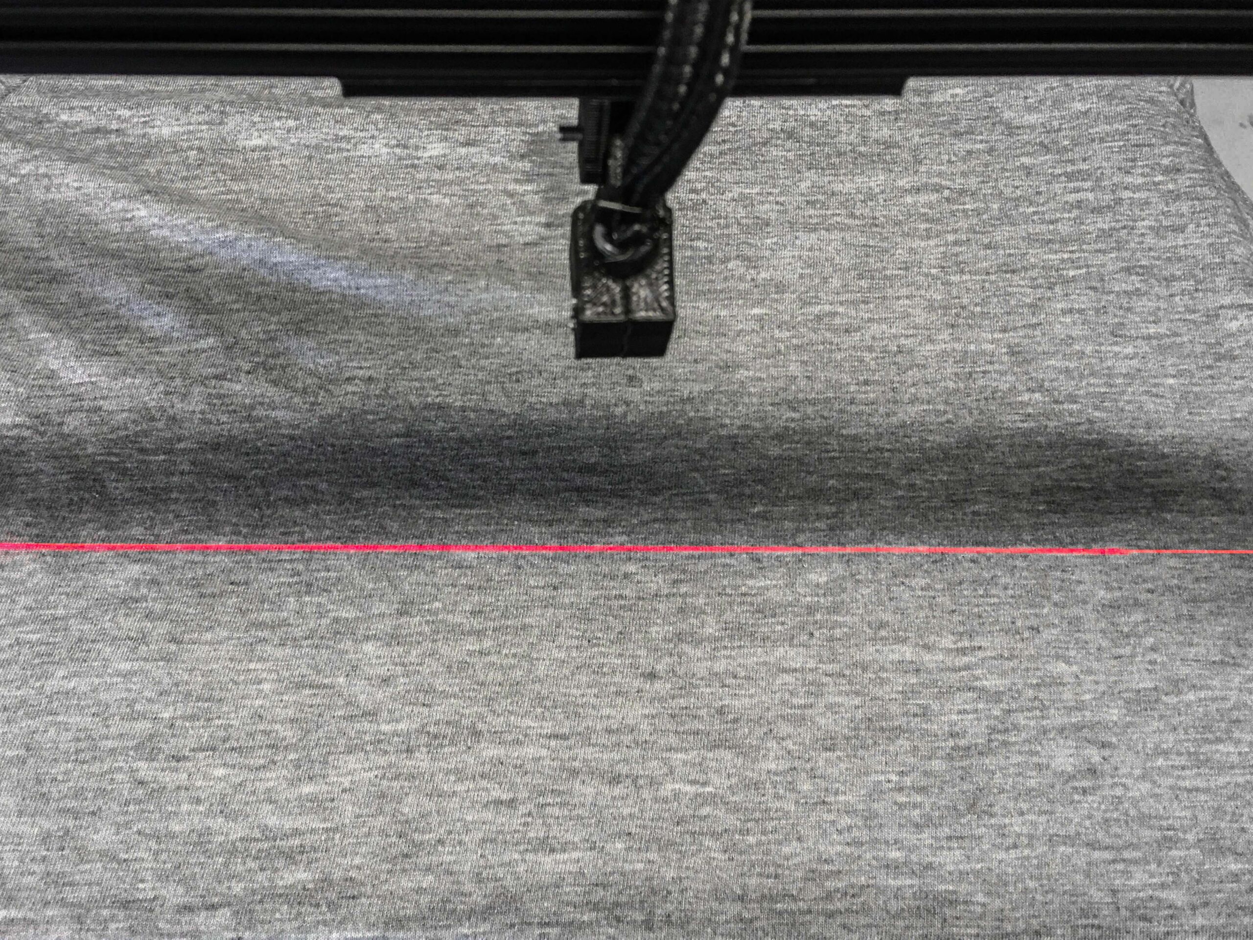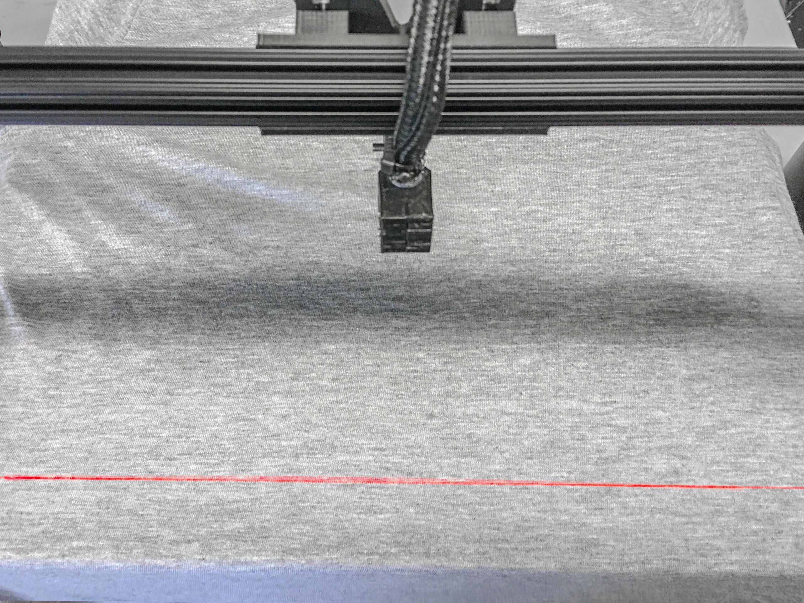 Once you have done this, find a spare shirt and load it onto the platen. Push the platen all the way in as if you were getting ready to pretreat. Now press the purge/prime button very quckly to spray a little bit of pretrearment onto the shirt. Now posistion the laser to the where the the spray started.