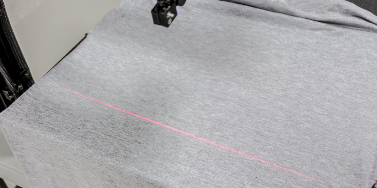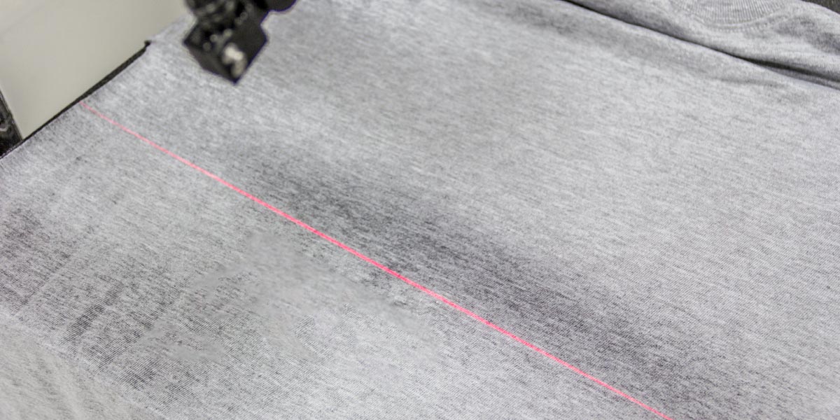 Press the purge button very quickly to spray the shirt with a little bit of water. This will give you start point of where the machine will start spraying. Adjust the laser to the starting point of spray on the shirt.